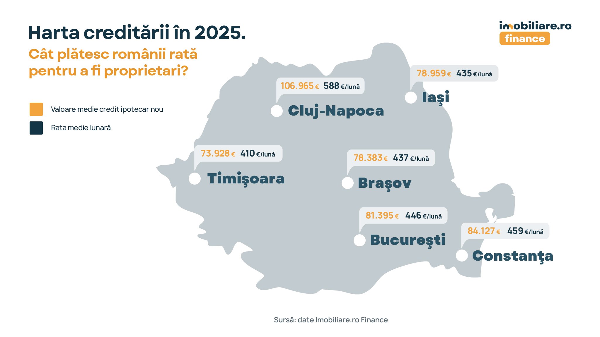 Valoarea medie a unui credit ipotecar nou a ajuns la 78.959 euro în Iași și la 78.383 euro în Brașov. Rata medie achitată lunar de ieșeni anul acesta a fost de 435 euro. Brașovenii au plătit 437 euro/lună.